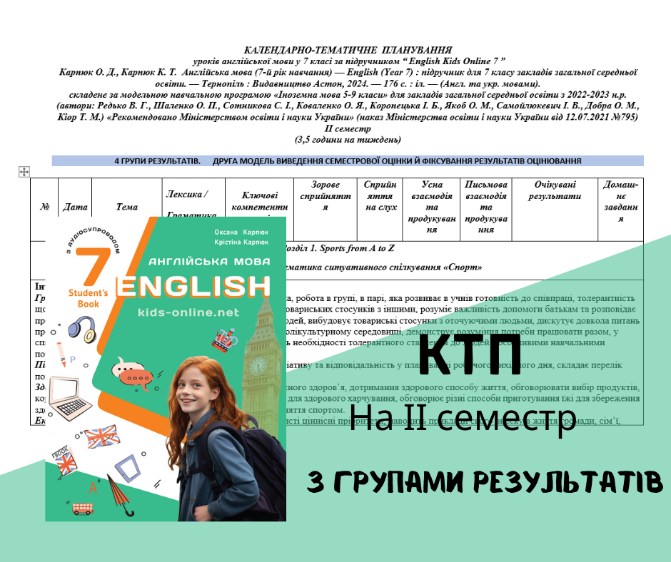 3, 3,5 та 4 години на тиждень (папка з різними варіантами КТП: на різну кількість годин, на 3 або на 4 групи результанів, на різні моделі оцінювання. Після оплати ви отримуєте УСІ 18 варіантів)