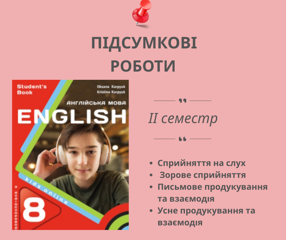 Комплект підсумкових робіт після кожного юніта та наприкінці ІІ семестру (усього 8 робіт за І семестр за групами результатів). У роботах є завдання на сприйняття на слух, зорове сприймання, говоріння та письмо. Кожна підсумкова робота у двох варіантах.