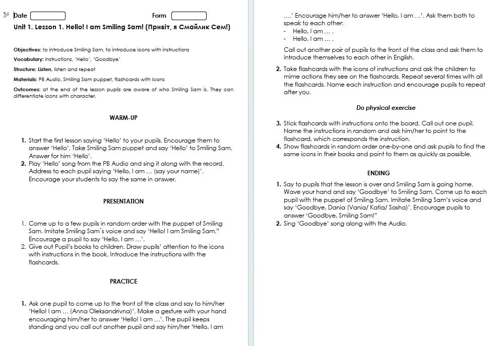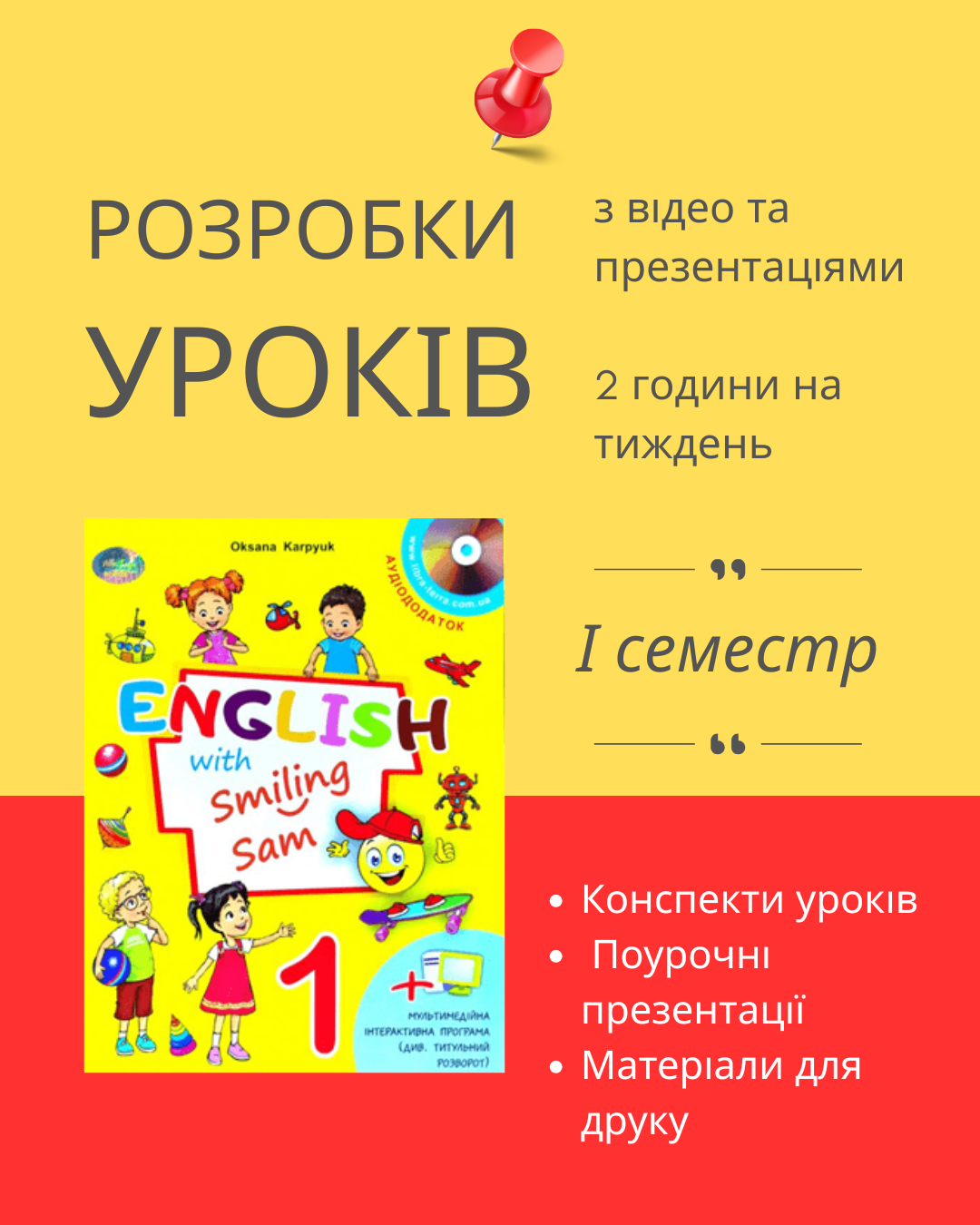 Комплект розробок на І семестр для 1 класу за підручником О. Карпюк містить конспекти уроків англійською мовою, поурочні презентації у PowerPoint, матеріали для роздруковування: роздаткові карти, флеш-картки, наочність, ігри, а також відео файли.