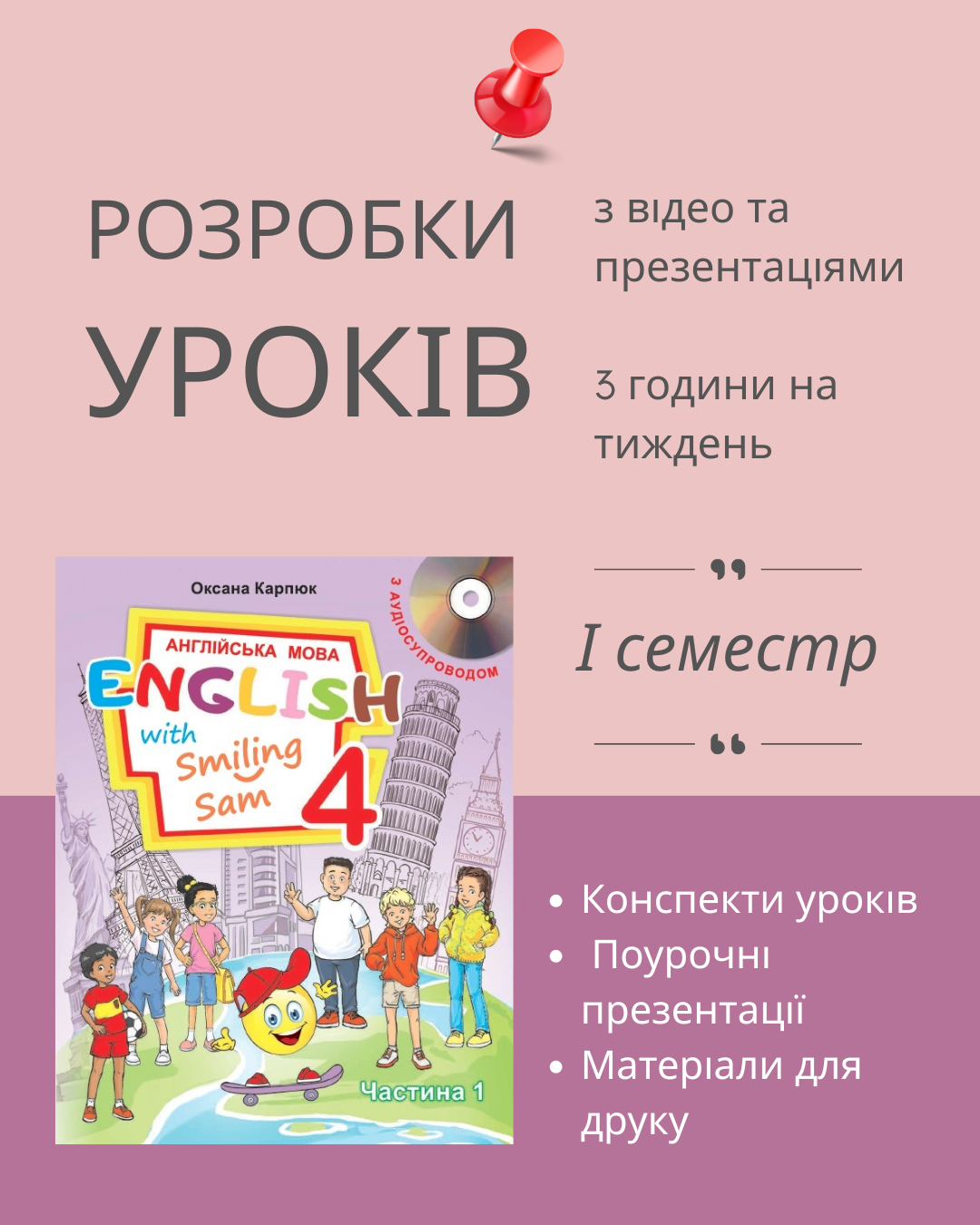 Комплект розробок на І семестр для 4 класу за підручником О. Карпюк містить конспекти уроків англійською мовою, поурочні презентації у PowerPoint, матеріали для роздруковування: роздаткові карти, флеш-картки, наочність, ігри, а також відео файли.