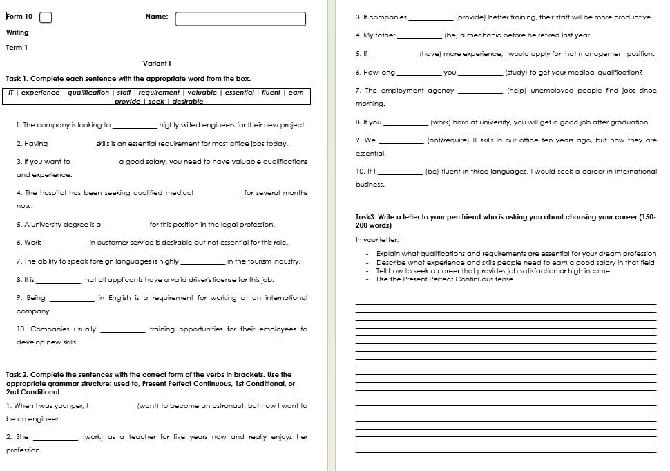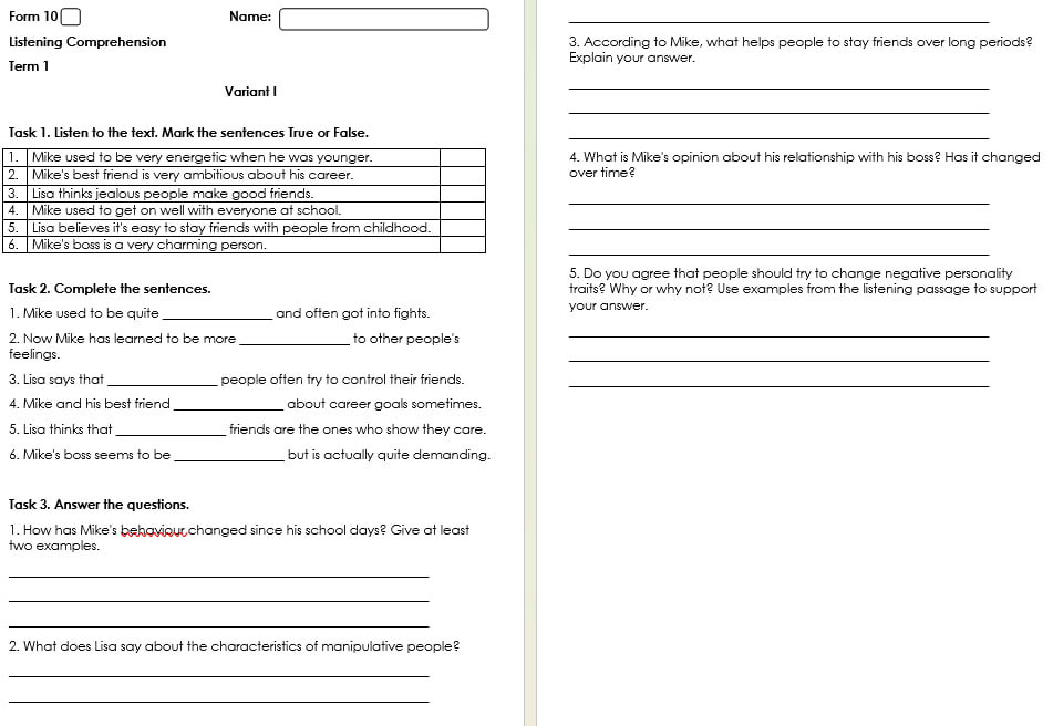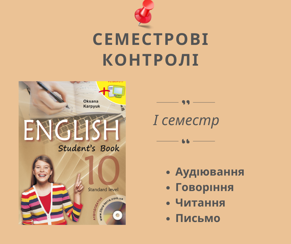 Комплект семестрових контролів аудіювання, говоріння, читання та письма на І семестр для 10 класу. Кожна робота у двох варіантах.