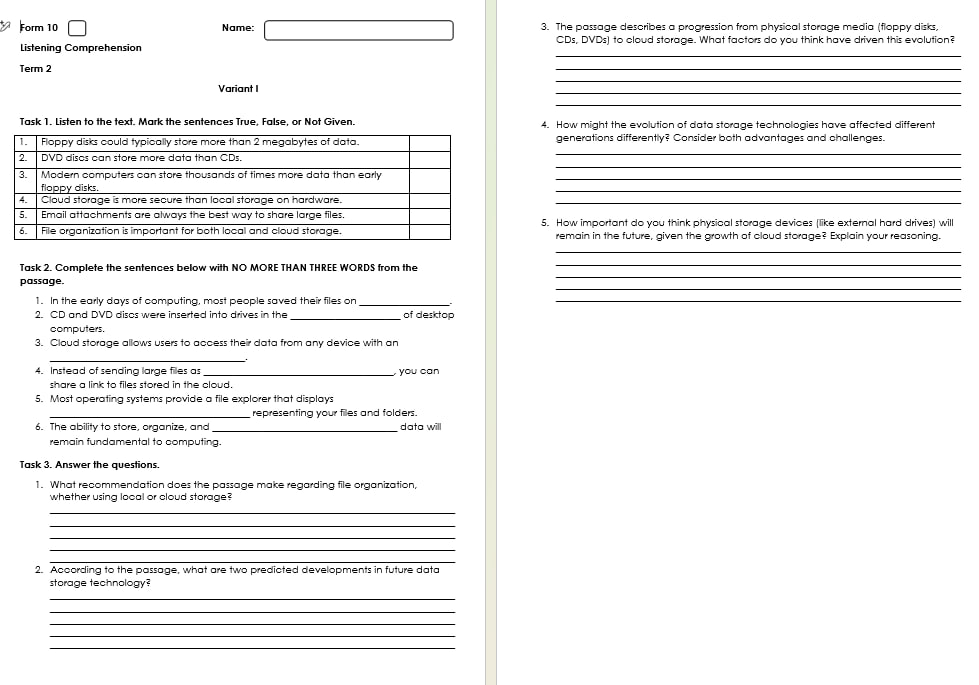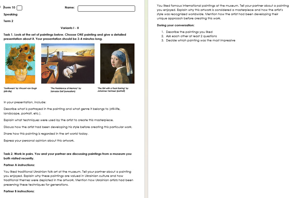 Комплект семестрових контролів аудіювання, говоріння, читання та письма на ІІ семестр для 10 класу. Кожна робота у двох варіантах.