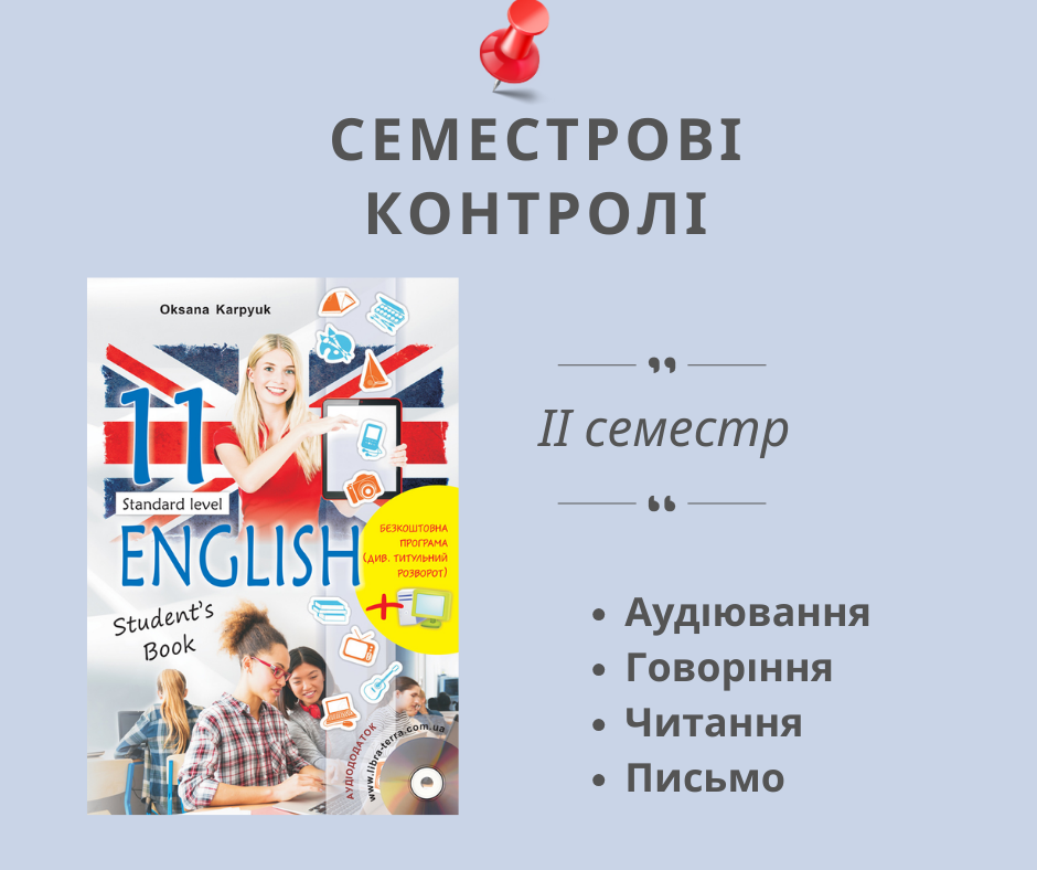 Комплект семестрових контролів аудіювання, говоріння, читання та письма на ІІ семестр для 11 класу. Кожна робота у двох варіантах.